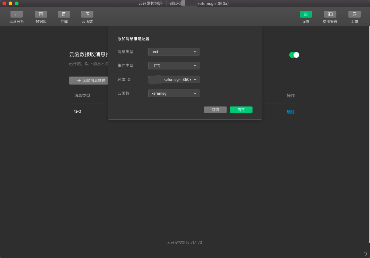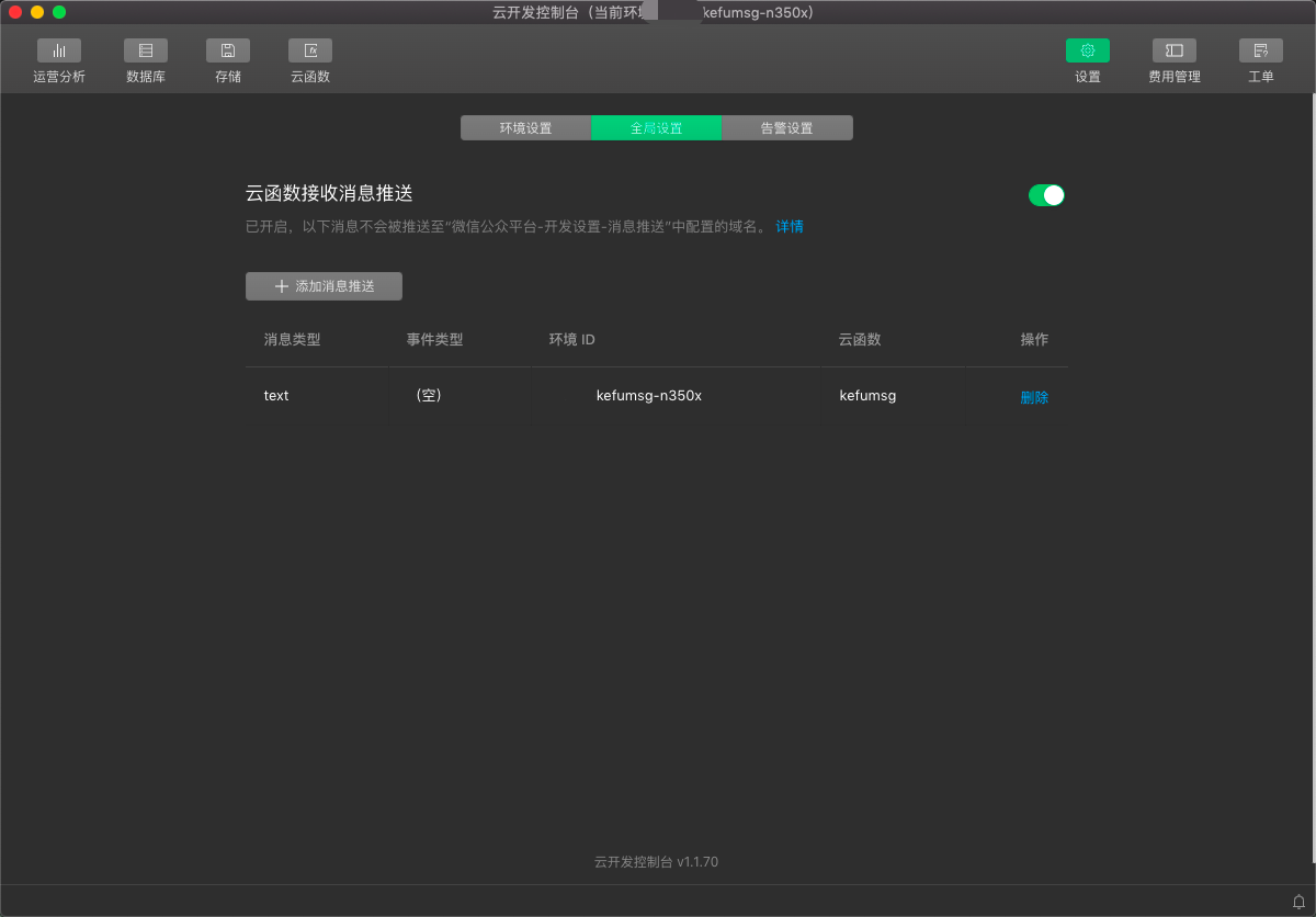 接着,在开发工具云开发控制台中选择设置->全局设置->添加消息推送,添加一条配置,这里只选择text类型: