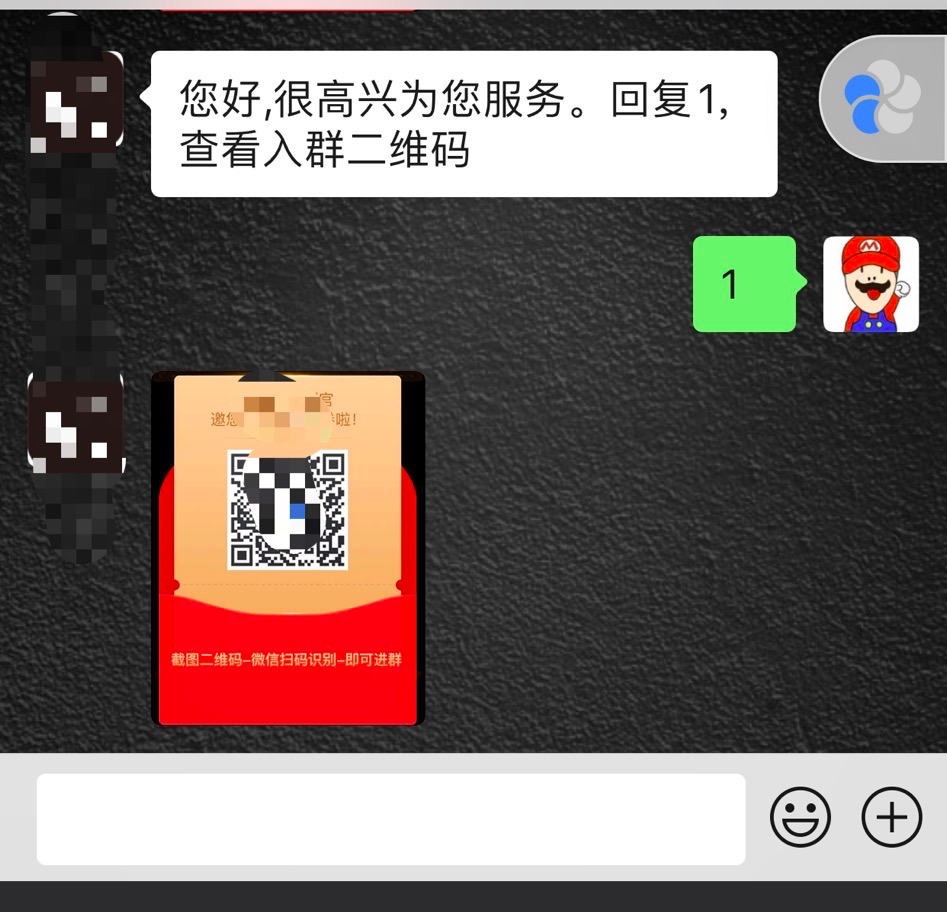 content: '您好,很高兴为您服务。回复1,查看入群二维码'