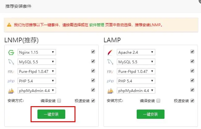 登陆进来面板后,会自动推荐你安装环境套件,这里有两种选择,第一种是LNMP套件,第二种是LAMP套件(如图):