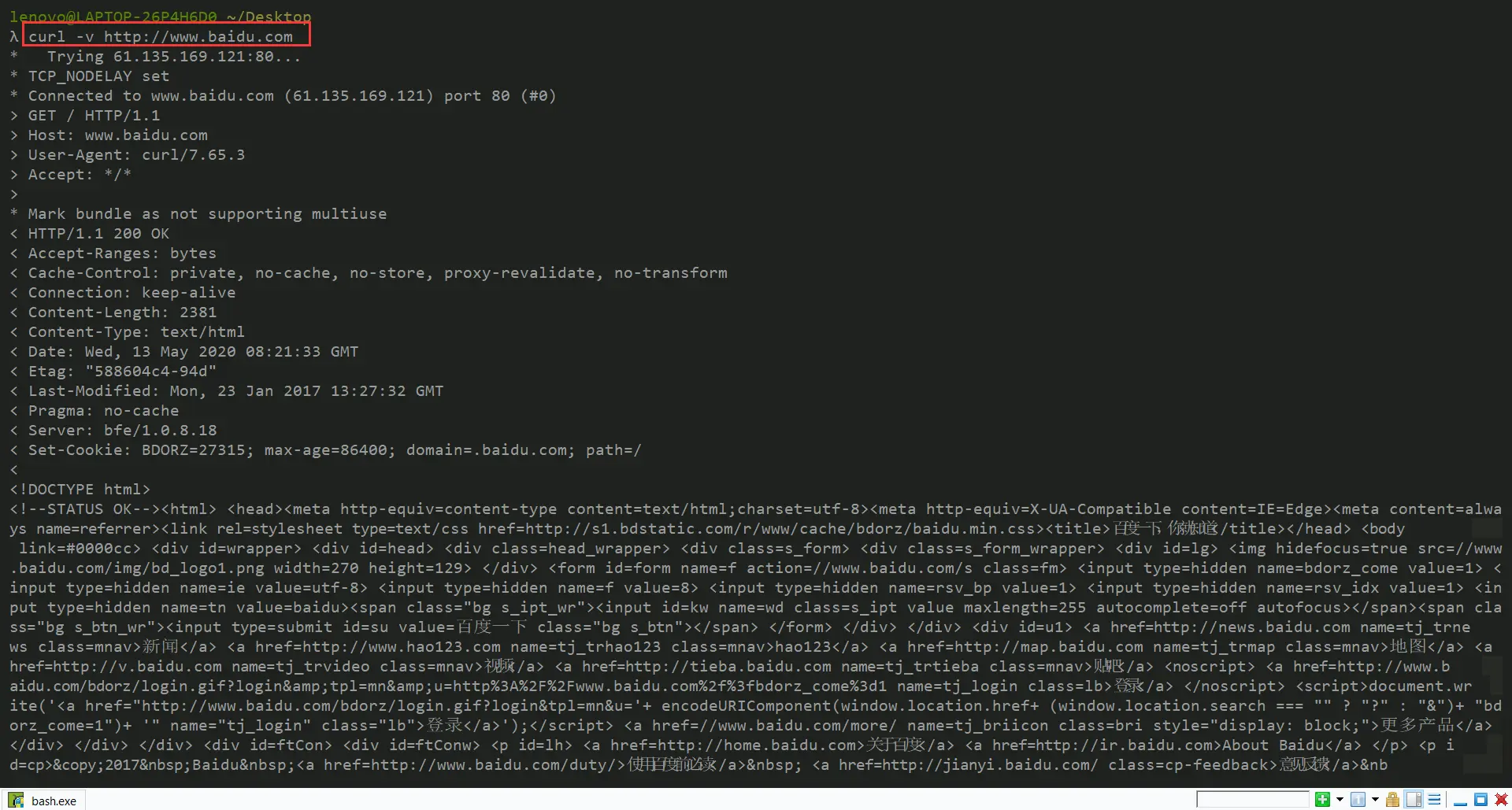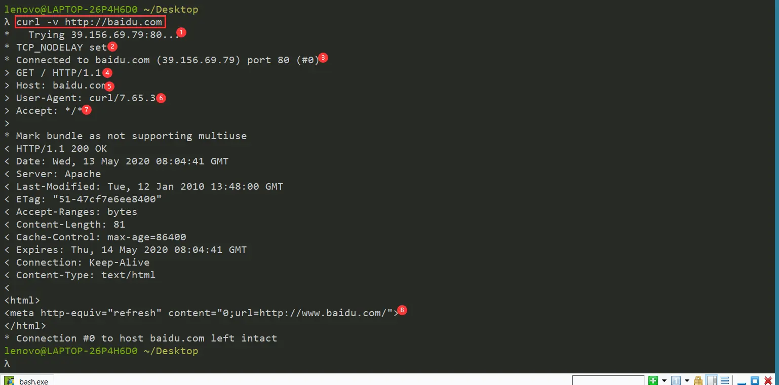 ③ 连接百度的80端口,连接成功后开始发送HTTP请求(以>开头的内容就是往百度发的内容