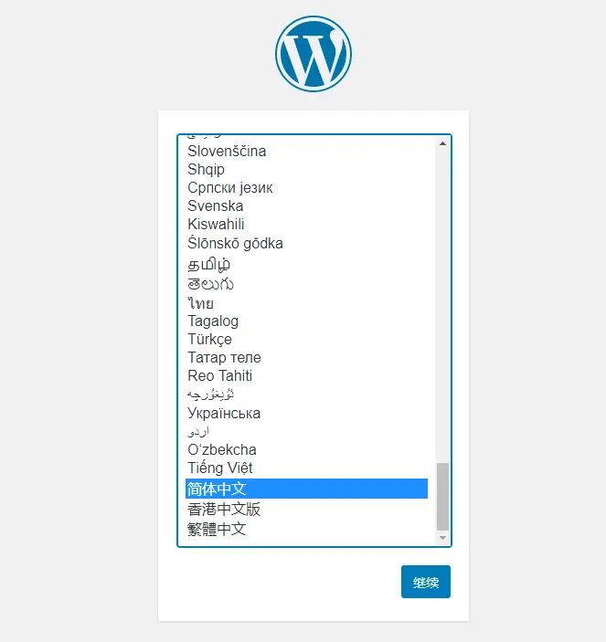 9.在线安装WordPress网站程序的时候,先选择语言“简体中文”,然后填写数据库名和密码(就是上一步叫你保存的)