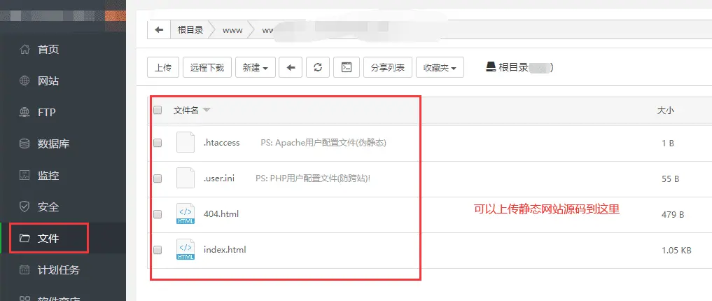 14.接着你可以将你的静态网站源码上传到你的网站目录里,也可以手动部署WordPress网站(需要在上一步里创建数据库)。