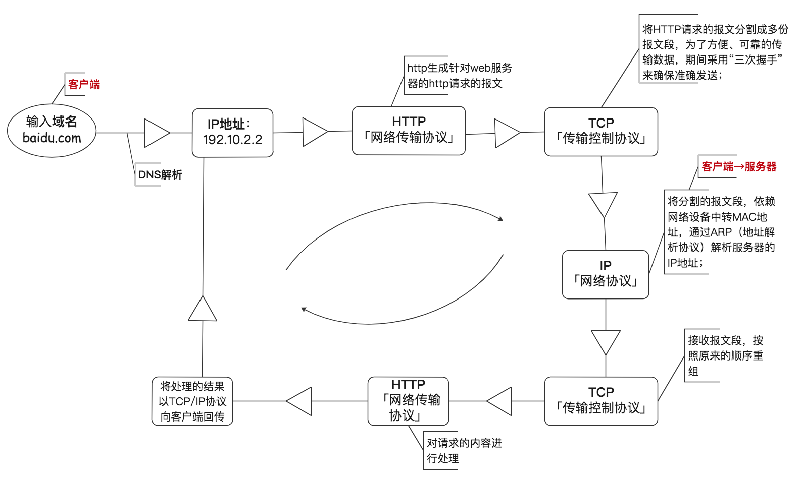 接着,TCP(传输控制协议)将HTTP请求的报文分割成多份报文段,为了方便、可靠的传输数据,期间采用“三次握手”来确保准确发送;「客户端」