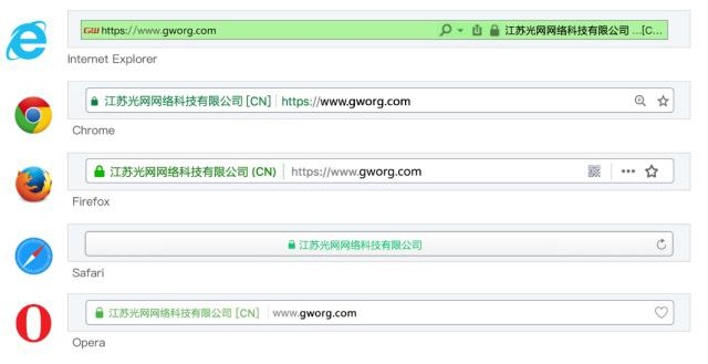 而假如你访问的是一个HTTPS网站时,情况却是完全不一样。你会发现浏览器的地址栏会变成绿色,企业名称会展示在地址栏中,地址栏上面还会出现一把“安全锁”的图标。这些都会给与用户很大的视觉上的安全体验。以下是EV证书在不同浏览器中的展现。