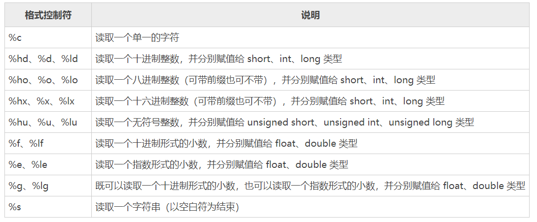(7) 在输入字符数据(%c)时,若格式控制串中无非格式字符,则认为所有输入的字符均为有效字符。