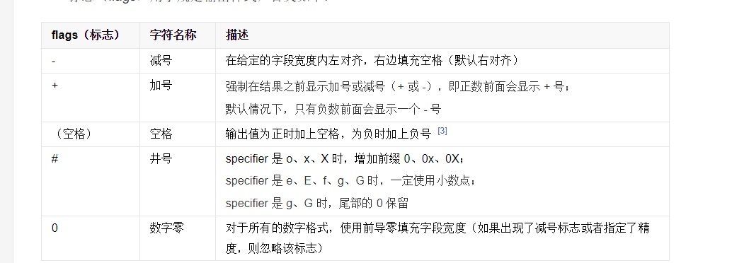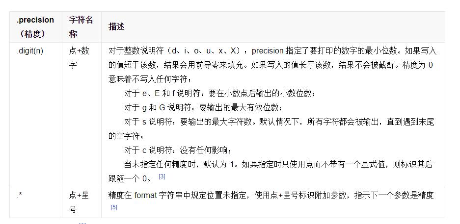 函数原形: %[flags][width][.precision][length]specifier,即:%[标志][最小宽度][.精度][类型长度]说明符 (其中如果加转换说明时,%和 说明符(格式符)不能省略,其他均可)