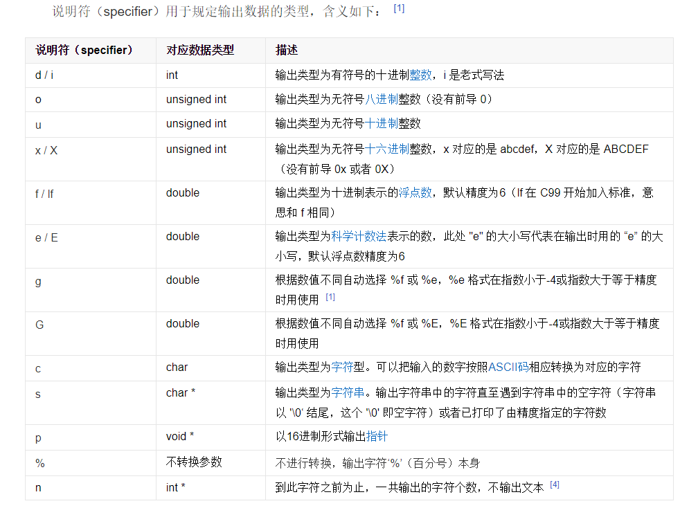 format -- 是格式控制字符串,其中两种类型的对象:普通字符和转换说明(加%那种) 。在输出时,普通字符将原样不动地复制到标准输出,转换说明并不直接输出而是用于控制 printf 中参数的转换和打印。每个转换说明都由一个百分号字符(%)开始,以转换说明结束,从而说明输出数据的类型、宽度、精度等