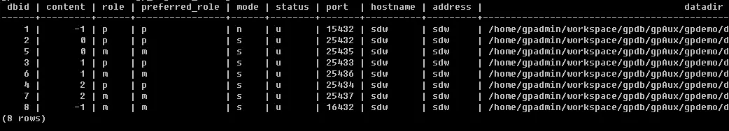 Greenplum通过catalog表gp_segment_configuration来维护包括master,standby在内的,所有节点的信息。这也是DBA了解集群状态最直观的方式。