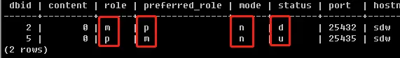 通过role可以看出,mirror成了primary,preferred_role没有变,同时原primary被标记成了mirror,但status是d。mode也被标记成了n。