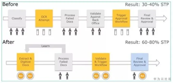 通过统计方法和机器学习。NLP将文本转换为数据,反之亦然,允许人与人之间有意义的互动。它包括自然语言理解和生成,例如:保险公司处理索赔、银行抵押贷款,这些都需要补充材料,包括图片(身份证信息)、表格信息、邮件信息、文本信息等等,这些都是非结构化信息,很难直接使用RPA自动化,影响了这个流程的效率。文本,电子邮件,信件和图像,首先通过NLP和图像识别技术以便进一步处理。