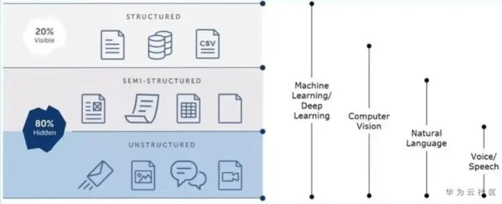 AA公司统计“暗数据”占比达80%,就像下图冰山在水下的部分。这些暗数据,导致信息是断裂的,传统的自动化不能访问。业界最头疼的就是如何处理这部分数据?