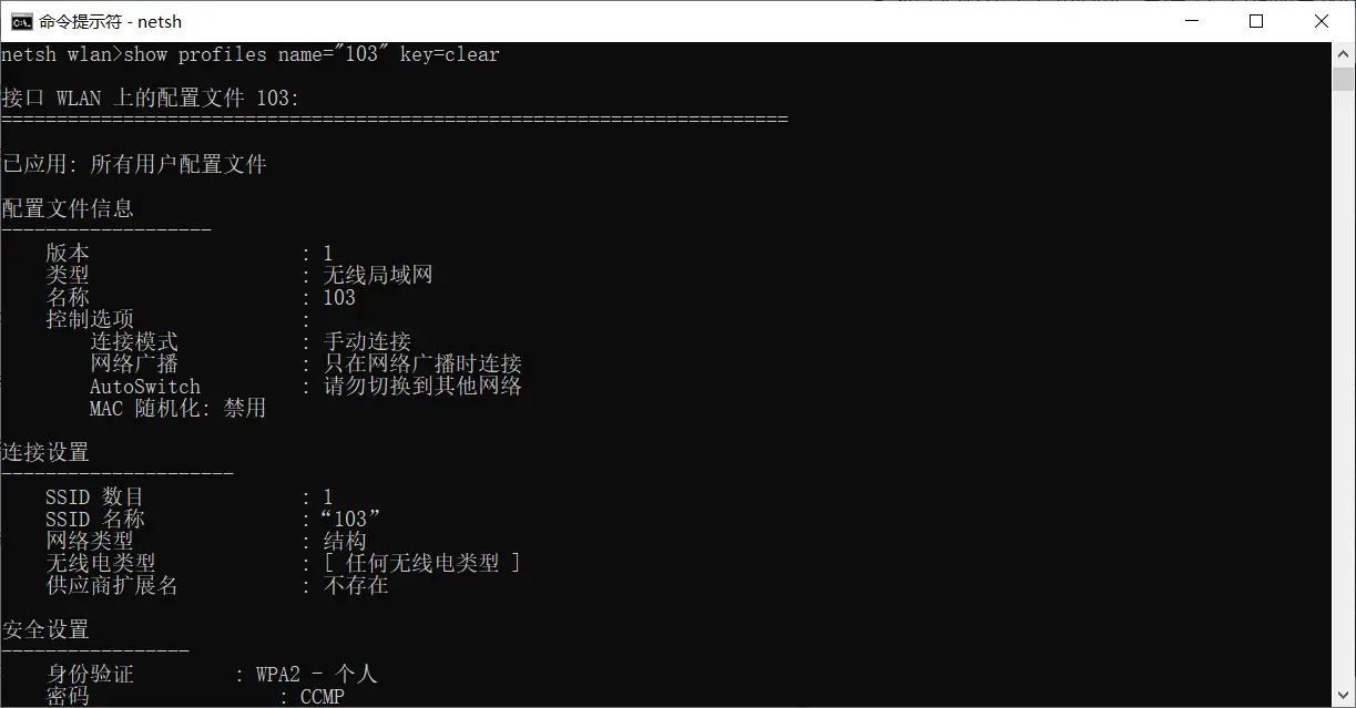 show profile name=“WIFI名称” key=clear来查询 -