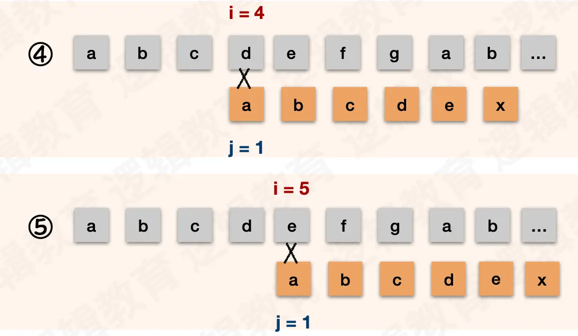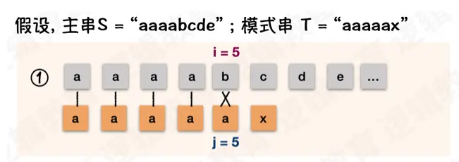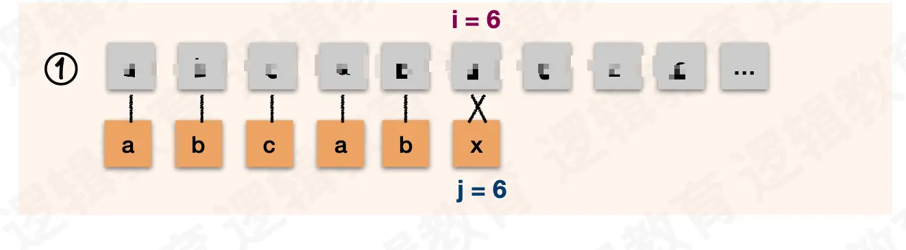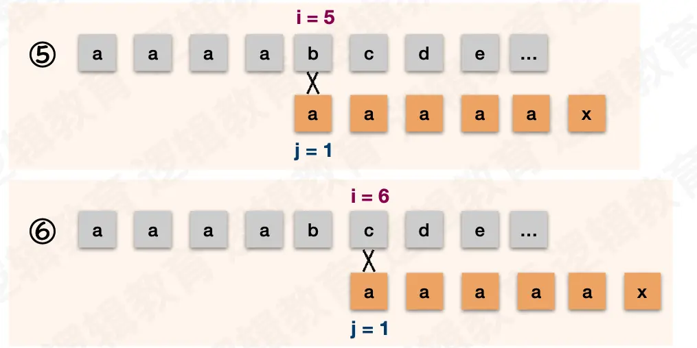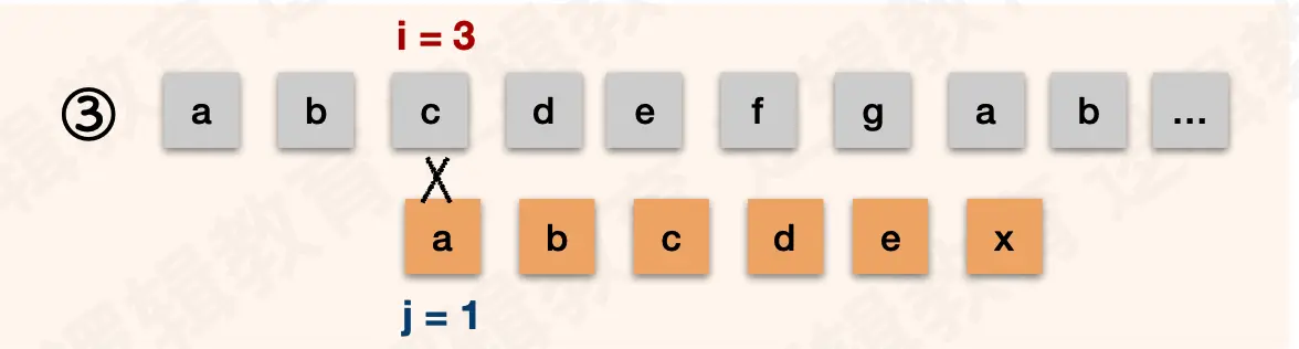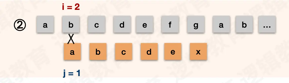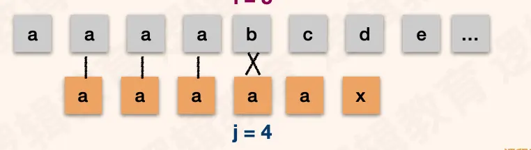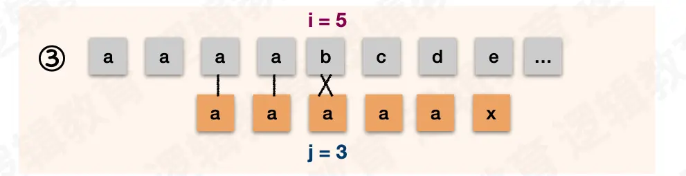 i都不需要回退,j在失配后需要回退到和前缀不一样的字符处。示例中的前缀是ab。