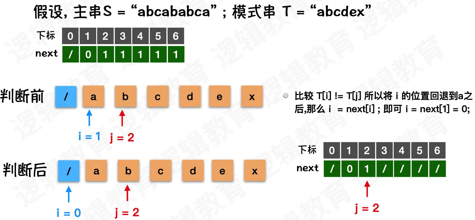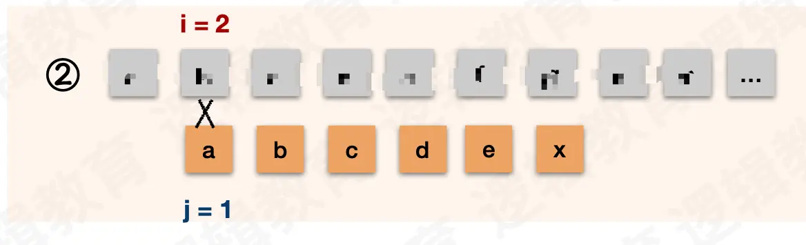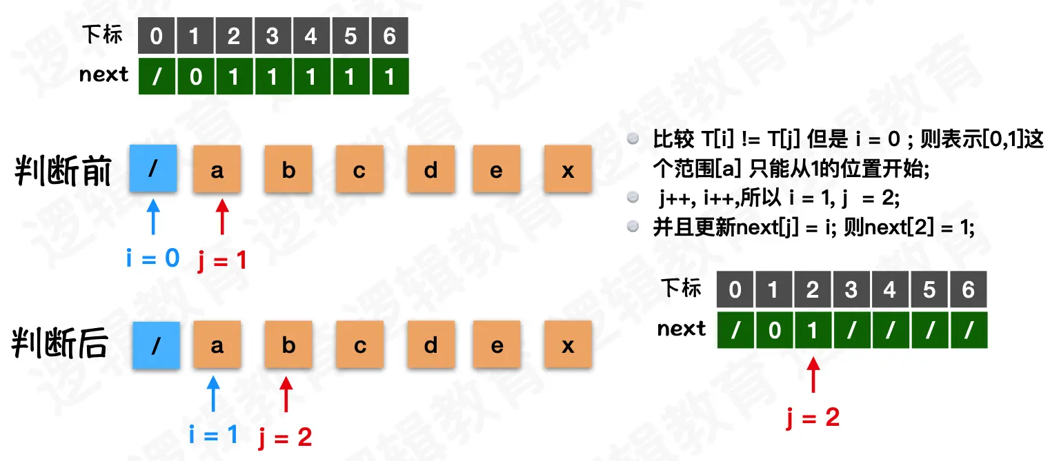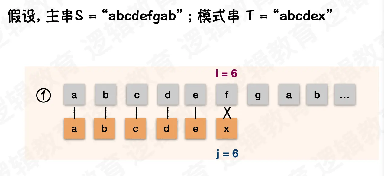i都不需要回退,j在失配后需要回退到和前缀不一样的字符处。示例中的前缀是ab。