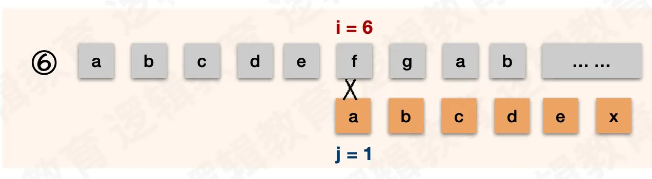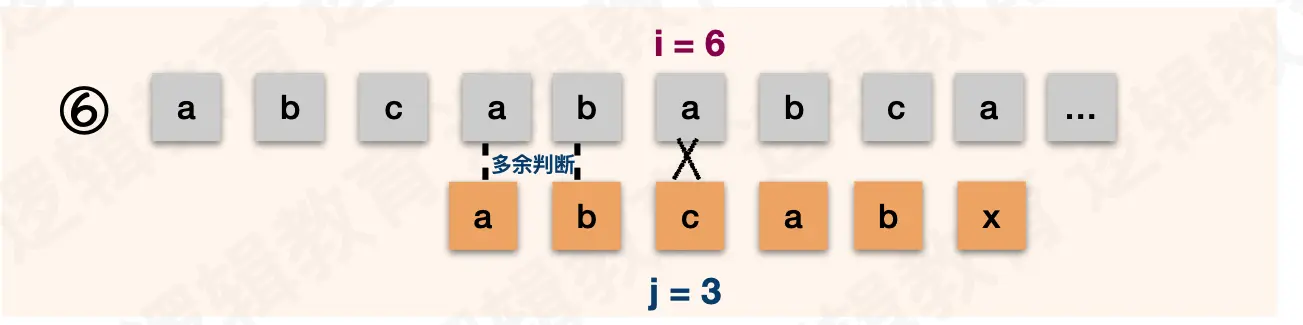 因为 s[2] != t[1] ,那么 i 也没有必要回退到 2 了,同理可以推论出:i 直接可以不动就在 6 号位。