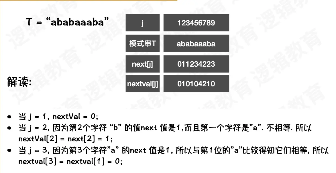 在上面的例子中,我们虽然根据 next 数组重新定位了 j,相对于 BF 算法已经十分优化了,但其实这个 j 的位置貌似并不是十分合适,因为 j 在后续的比较中接连失配,再加上这个模式串t前面一连串的aaaa,我们有理由怀疑这个地方是有问题的😁