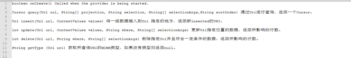 比如, 一个请求列车信息的URI如content://com.example.transportationprovider/trains/122 可能就会返回typevnd.android.cursor.item/vnd.example.rail这样一个MIME类型。vnd.android.cursor.dir/vnd.yourcompanyname.contenttype (多个记录的MIME类型)