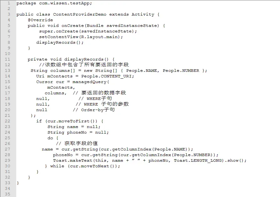 在实际应用中,我们很少实现ContentResolver抽象类,更多时候通过getContentResolver()从一个Activity或其它应用程序组件的实现里获取一个ContentResolver: