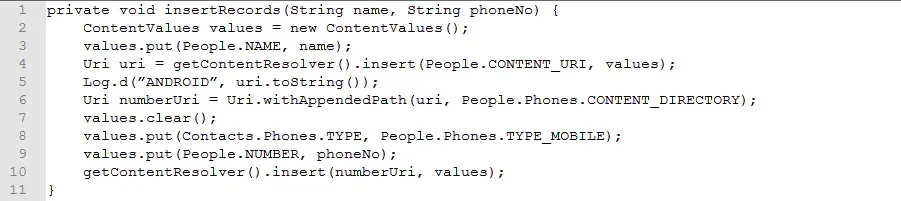 上面的例子中我们都是基于联系人信息簿这个标准的Content Provider,现在我们继续来创建一个insertRecord() 方法以对联系人信息簿中进行数据的添加: