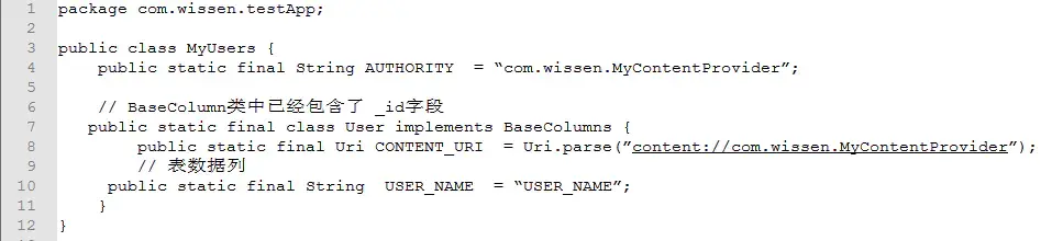 定义一个名为CONTENT_URI,并且是public static final的Uri类型的类变量,你必须为其指定一个唯一的字符串值,最好的方案是以类的全名称, 如: