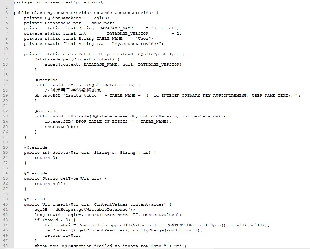 下列代码将创建一个Content Provider,它仅仅是存储用户名称并显示所有的用户名称(使用 SQLLite数据库存储这些数据):