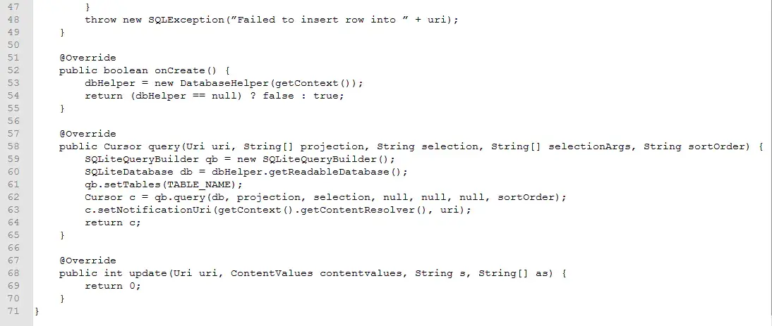 查询返回一个Cursor类型的对象。所有执行写操作的方法如insert(), update() 以及delete()都将被监听。我们可以通过使用ContentResover().notifyChange()方法来通知监听器关于数据更新的信息。