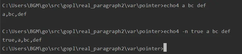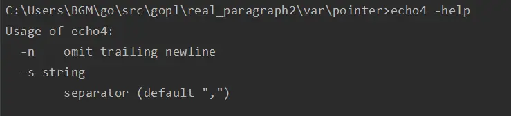 指针是实现标准库中flag包的关键技术,它使用命令行参数来设置对应变量的值,而这些对应命令行标志参数的变量可能会零散分布在整个程序中。为了说明这一点,在早些的echo版本中,就包含了两个可选的命令行参数:-n用于忽略行尾的换行符,-s sep用于指定分隔字符(默认是空格)。
