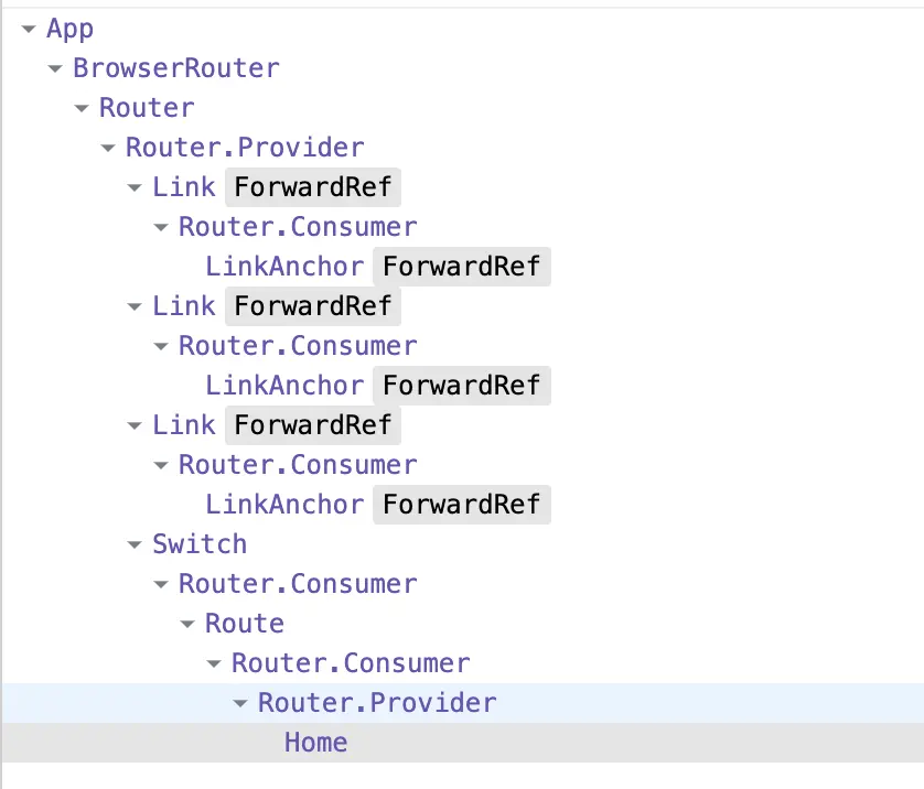 Link组件最终会render一个包裹着Router.Consumer的LinkAnchor组件。Router.Consumer是为了获取外层Router组件的history对象等信息,LinkAnchor绑定了特殊的点击跳转逻辑的标签。这里先不展开。