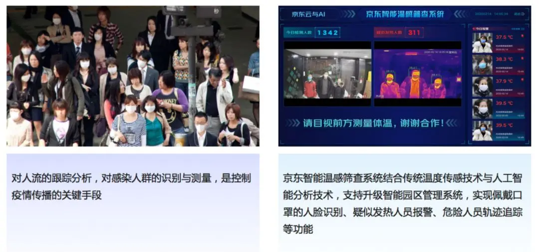 比如京东集团的无感知智能温感筛查系统,能够结合传统的温感技术以及近期快速研发的人脸识别技术,实现大流量背景下的人员跟踪,从而有效控制感染的扩散,协助实现疫情管控的效率提升。