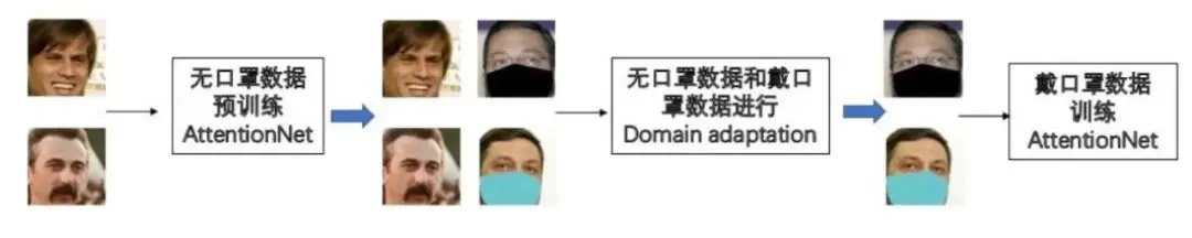 “我们还发现在不戴口罩数据上训练的模型对戴口罩的人脸依然有一定的识别能力,所以我们先在大量的不戴口罩的常规人脸数据上进行模型训练,然后再通过domain adaptation将模型迁移到戴口罩人脸识别数据上继续训练。”