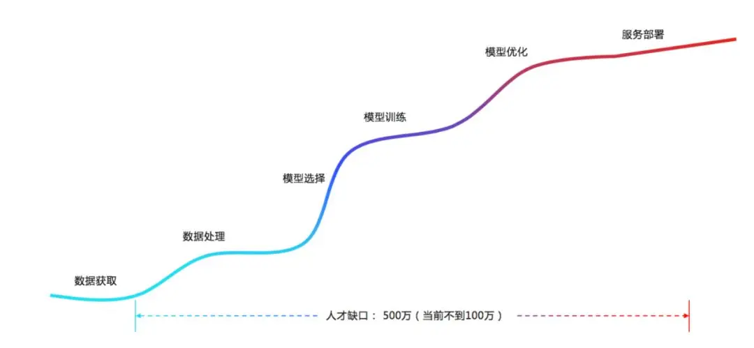从数据获取、数据处理、模型选择、模型训练以及模型优化和最终上线,根据整个AI落地的大概生命周期,是需要在实际的生长环境里做部署的。为什么AI落地比较困难?是因为在整个生命周期里面,拥有相匹配技能的人才还是非常少的。根据一些权威机构比较一致的评测数据,中国目前的AI人才缺口大概有500万左右。可以想象,这种情况会导致大部分的AI人才被诸多大厂争夺。但是对一些有实际应用落地场景需求的小型公司及传统企业,就无法进行项目的建设和落实。同时,人才缺口短时间内难以弥补。AI落地困难重重,每一个环节上都需要AI的技术人才掌握相匹配的技术,并非是一蹴而就的。