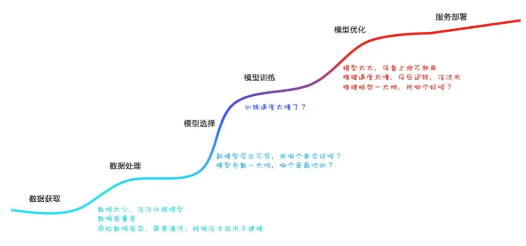 在开发模型的过程中,首先在数据处理方面,最常见的挑战就是数据量过小、质量比较差或过于庞杂,导致算法工程师需要做大量数据清洗、转换、兼容等的额外工作。同时在模型训练中,诸多参数的选择也是一个烦琐的探索尝试过程。当模型开发完成,上线前仍需进行模型优化……每一个环节都需要对AI工程师有较高的技术要求。在这样技术挑战下,就会导致AI落地的速度问题。同时为了在业务效果上领先对手,在一个业务上我们往往要投入很多算法工程师,将每一个步骤都做到极致,这样看下来,AI应用怎么可能很容易的落地呢?