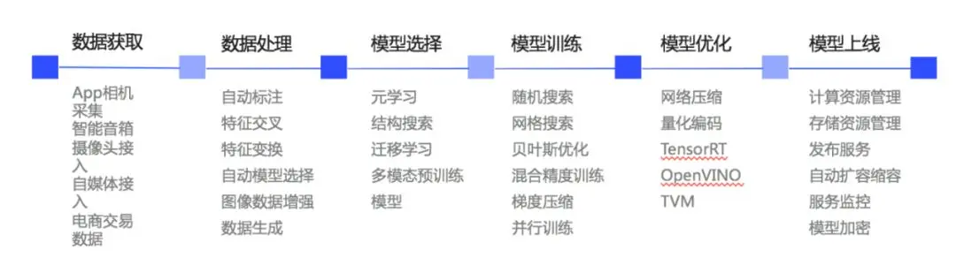 1913年左右,福特应用他的创新理念和反向思维逻辑,提出建立一个汽车组装的流水线。通过流水线的装车方式,汽车生产效率得到非常大的提升。这个事件激发了思考:如果在AI的开发过程中,是不是也能够采取类似的开发方式,形成一个端到端的流水线,从而使AI的快速落地成为可能?当然,在AI领域,这个流水线的每一个环节里,都需要用特别的技术去解决以上这些挑战。这里的关键技术就是AutoML。