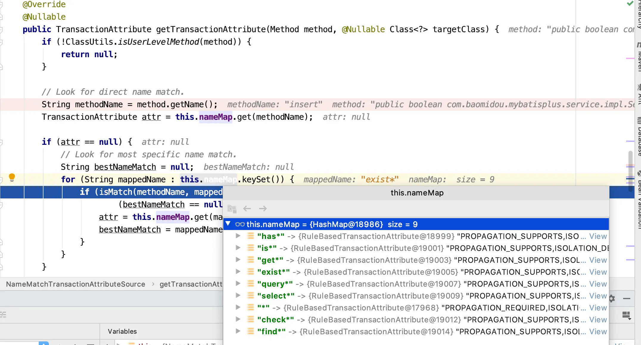 如使用注解声明事务时,会调用AnnotationTransactionAttributeSource的getTransactionAttribute方法,经调试得知,这里调用的是NameMatchTransactionAttributeSource的getTransactionAttribute方法,如下图所示。