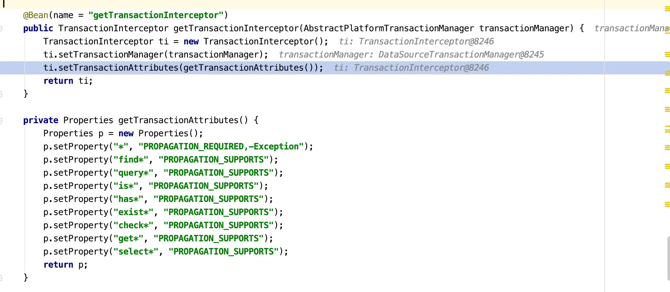 看源码可知:在NameMatchTransactionAttributeSource的setProperties方法中调用setNameMap方法为nameMap字段赋值,而setProperties方法由TransactionAspectSupport的setTransactionAttributes调用,该方法的源码如下。