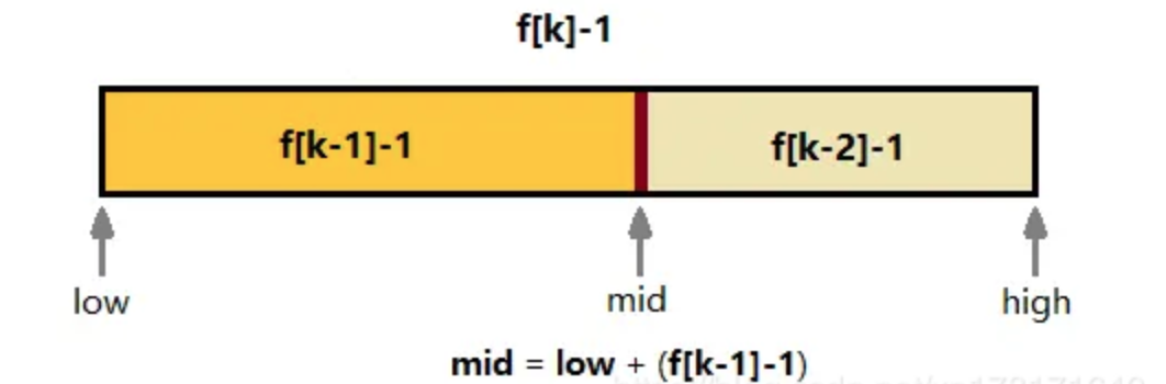 F[k-1]-1+1+F[k-2]-1 = F[k]-1 这种情况下假如mid和key不匹配,那我们的下一个区间也是符合F[k]-1的这种格式