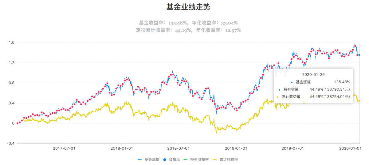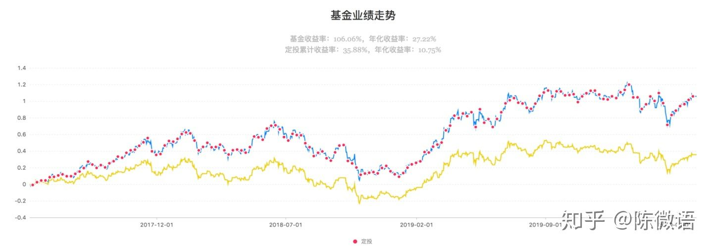 也就是说,这个基金是在不被看好的时候,开始定投,在低价位积攒了很多筹码,然后在最近一年厚积薄发,才有了如此之高的定投收益率。