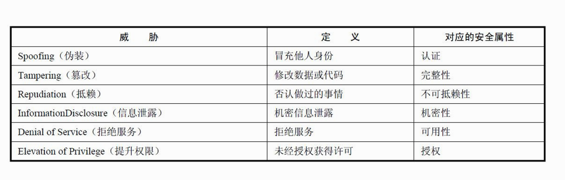 主要包括伪装、篡改、抵赖、信息泄露、拒绝服务、提升权限。