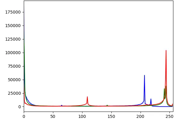 绘制BGR直方图from matplotlib import pyplot as plt img = cv2.imread('12.jpg') for i,col in enumerate(color): histr = cv2.calcHist([img],,None,[256],[0,256])