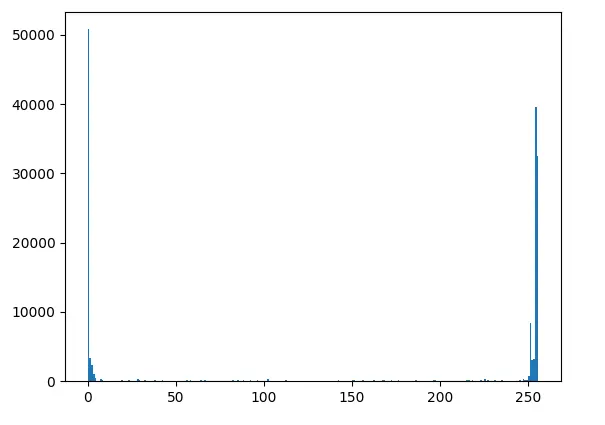 img = cv2.imread('home.jpg',0) hist = cv2.calcHist([img],[0],None,[256],[0,256]) hist是一个256×1的数组,表示每个灰度值对应像素的个数 hist,bins = np.histogram(img.ravel(),256,[0,256]) 与上面的函数一样,但是bins值是257,因为Numpy的计算方式是最后一个范围是255-255.99 在numpy当中还有函数np.bincount(),运行速度很快。所以以为直方图最好使用该函数,minlength=256。例如,hist=np.bincount(img.ravel() ,minlength=256) 然而,opencv函数比上面的函数要更块,所以尽量使用opencv函数 使用函数matplotlib.pyplot.hist(),该函数可以直接统计绘制中方图。统计函数为calcHist() 或 np.histogram() from matplotlib import pyplot as plt img = cv2.imread('10.jpg',0) plt.hist(img.ravel(),256,[0,256]); 结果如下