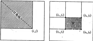 文中的高斯差分方程是SIFT算法当中,发明者想要利用两个相邻高斯尺度空间的图像相减来得到一个LOG的近似,因为这样做可以节省时间,而且可以控制精度变化,类似于高等数学当中泰勒公式那玩意-_- 。关于SIFT原理可以看上一篇博客 文中提到的积分图像实际上原理非常简单,类似递推方程。积分图像的目的是想建立一个函数,能够快速得到一个矩形图像区域当中所有像素值的和是多少。那么,设<span class="MathJax" id="MathJax-Element-98-Frame" tabindex="0" data-mathml="p(i,j)" role="presentation" style="box-sizing: border-box; outline: 0px; display: inline; line-height: normal; text-align: left; word-spacing: normal; word-wrap: normal; white-space: nowrap; float: none; direction: ltr; max-width: none; max-height: none; min-width: 0px; min-height: 0px; border: 0px; word-break: break-all; position: relative;">p(i,j)p(i,j)表示从<span class="MathJax" id="MathJax-Element-99-Frame" tabindex="0" data-mathml="(0,0)" role="presentation" style="box-sizing: border-box; outline: 0px; display: inline; line-height: normal; text-align: left; word-spacing: normal; word-wrap: normal; white-space: nowrap; float: none; direction: ltr; max-width: none; max-height: none; min-width: 0px; min-height: 0px; border: 0px; word-break: break-all; position: relative;">(0,0)(0,0)点到<span class="MathJax" id="MathJax-Element-100-Frame" tabindex="0" data-mathml="(i,j)" role="presentation" style="box-sizing: border-box; outline: 0px; display: inline; line-height: normal; text-align: left; word-spacing: normal; word-wrap: normal; white-space: nowrap; float: none; direction: ltr; max-width: none; max-height: none; min-width: 0px; min-height: 0px; border: 0px; word-break: break-all; position: relative;">(i,j)(i,j)点的所有像素的和是多少,存储在<span class="MathJax" id="MathJax-Element-101-Frame" tabindex="0" data-mathml="p(i,j)" role="presentation" style="box-sizing: border-box; outline: 0px; display: inline; line-height: normal; text-align: left; word-spacing: normal; word-wrap: normal; white-space: nowrap; float: none; direction: ltr; max-width: none; max-height: none; min-width: 0px; min-height: 0px; border: 0px; word-break: break-all; position: relative;">p(i,j)p(i,j)这个数组里面,如果想要获得W区域的像素和是多少,如图,只要计算<span class="MathJax" id="MathJax-Element-102-Frame" tabindex="0" data-mathml="p(i4,j4)−p(i2,j2)−p(i3,j3)+p(i1,j1)" role="presentation" style="box-sizing: border-box; outline: 0px; display: inline; line-height: normal; text-align: left; word-spacing: normal; word-wrap: normal; white-space: nowrap; float: none; direction: ltr; max-width: none; max-height: none; min-width: 0px; min-height: 0px; border: 0px; word-break: break-all; position: relative;">p(i4,j4)−p(i2,j2)−p(i3,j3)+p(i1,j1)p(i4,j4)−p(i2,j2)−p(i3,j3)+p(i1,j1)即可。