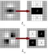 这个特征描述符的长度使64,降低维度可以加速计算,又可以区分特征。为了更好的区分特征点,SURF还使用了长度为128特征描述符。当dy小于0或者大于0时,计算dx或|dx|的和。同样,根据dx的符号计算不同的dy和。因此能够获得双倍的特征。计算复杂度也不会增加。opencv当中的extended参数为0或1时分别对应64和128的特征。 另外一个重要的改善是对潜在的兴趣点使用了拉普拉斯算子符号(黑塞矩阵的迹)。由于之前的计算已经完成对黑塞矩阵的构造,所以这步不会增加复杂度。 拉普拉斯符号在不同明暗背景下区分不同亮度的斑点,在匹配阶段,我们只需要比较拥有相同对比度的特征是否匹配即可,这样加快了计算速度,如图。 SURF算法的速度是SIFT速度的3倍,善于处理模糊和旋转的图像,但是不善于处理视角变化和关照变化。 (解释) 文中的小波响应运算,全称是haar小波运算。这里使用haar小波目的是为了获取图像梯度,使用之前计算好的图像积分结果,这样能够提高计算速度。与SIFT算法类似,在对每个特征点获取主方向时,使用原文中提到的一个π/3大小的扇形窗口,同时以0.2弧度为步长旋转滑动此窗口,在每个窗口当中对的haar响应值的水平方向,垂直方向进行累加。由于时使用一个圆形区域,转换成类似极坐标矢量的方式来表示,每个窗口中的结果<span class="MathJax" id="MathJax-Element-107-Frame" tabindex="0" data-mathml="(mw,θw)" role="presentation" style="box-sizing: border-box; outline: 0px; display: inline; line-height: normal; text-align: left; word-spacing: normal; word-wrap: normal; white-space: nowrap; float: none; direction: ltr; max-width: none; max-height: none; min-width: 0px; min-height: 0px; border: 0px; word-break: break-all; position: relative;">(mw,θw)(mw,θw),如图。