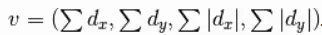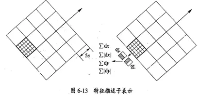 对于特征点描述的建立,SURF再一次使用Haar小波响应,同时使用积分图像使操作变得简单。在一个矩形区域当中,以特征点为中心,划取周围20s×20s区域的大小,以特征点为原点,主方向为横轴,分成四个子区域,每个子区域使用2s的Haar小波响应,对于每个子区域,获取一个向量,记录垂直、水平方向上的小波响应值,如图。