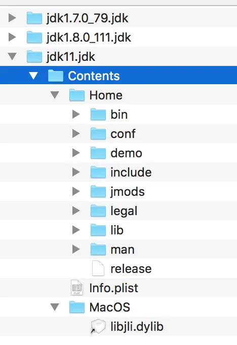 4、macOS JDK 默认目录在/Library/Java/JavaVirtualMachines,把第 2 步解压的内容放到此目录下,之后编译的过程中会在这个目录下查找 JDK 10 或 JDK 11。