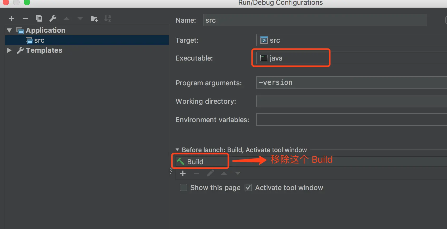 2、配置 Debug Configurations,选择 Executable 为编译好的 java 可执行程序,在 bin 目录下,并且移除 Build 设置。