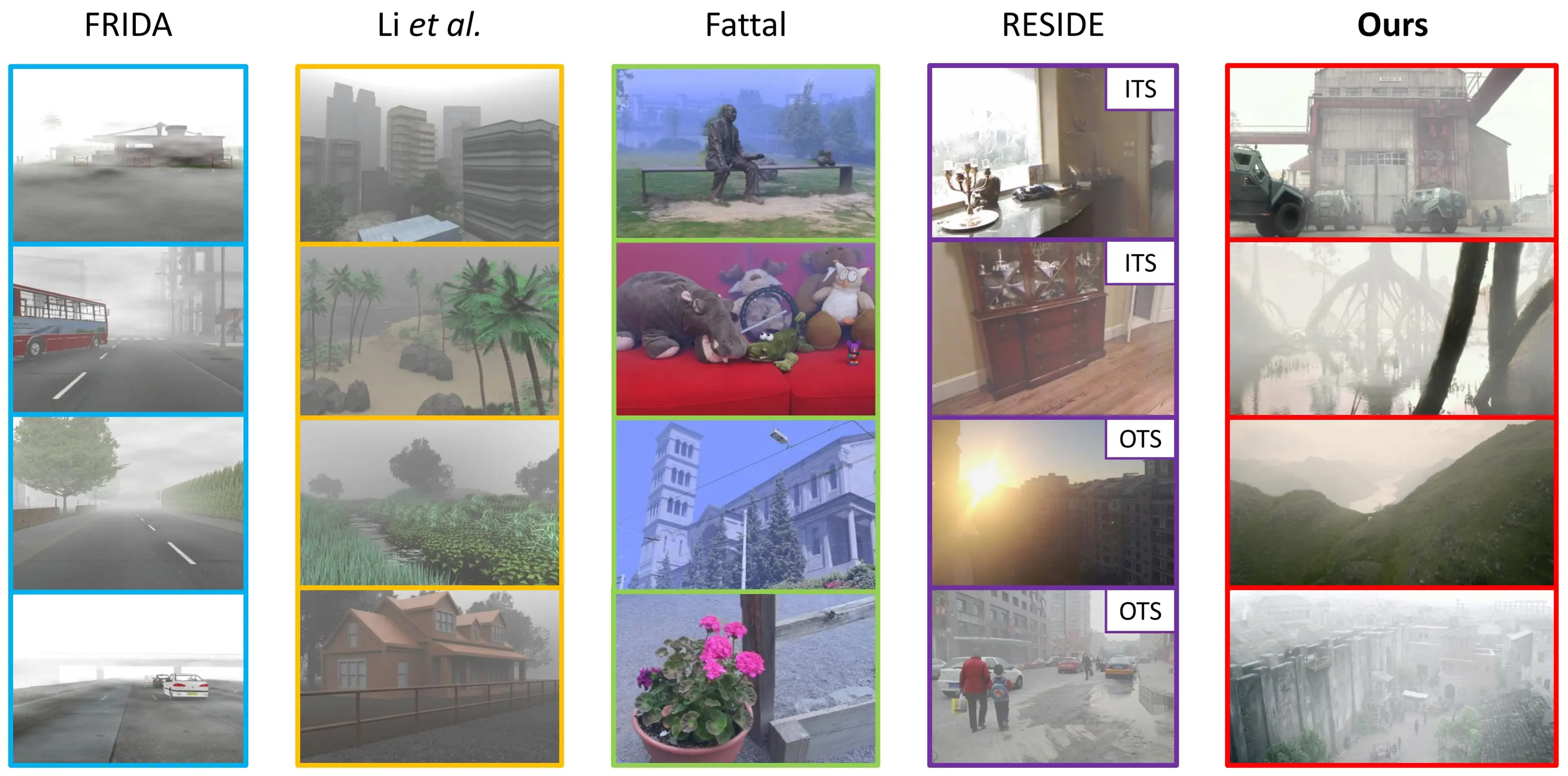 当前的大多的合成数据集都在室内,缺乏相应的具有准确深度的室外环境的数据集。文章提出了关于数据驱动的去雾算法的两个重要问题: