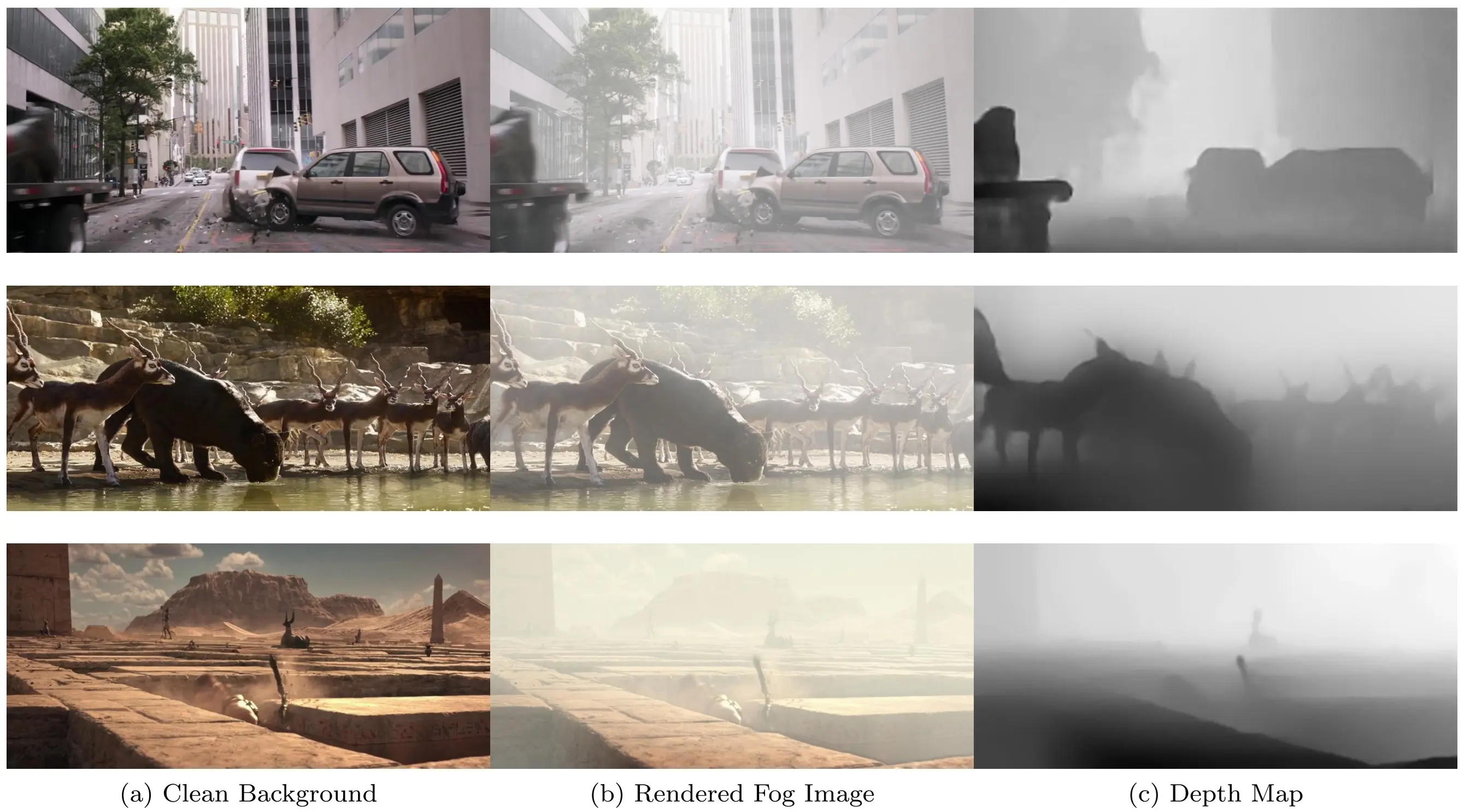 这些清晰干净的无雾图像是来自多视图立体摄像机拍摄的BlueRay视频,一共22个视频,总时长约40小时。这些高质量的3D视频包括好莱坞电影和科学纪录片。