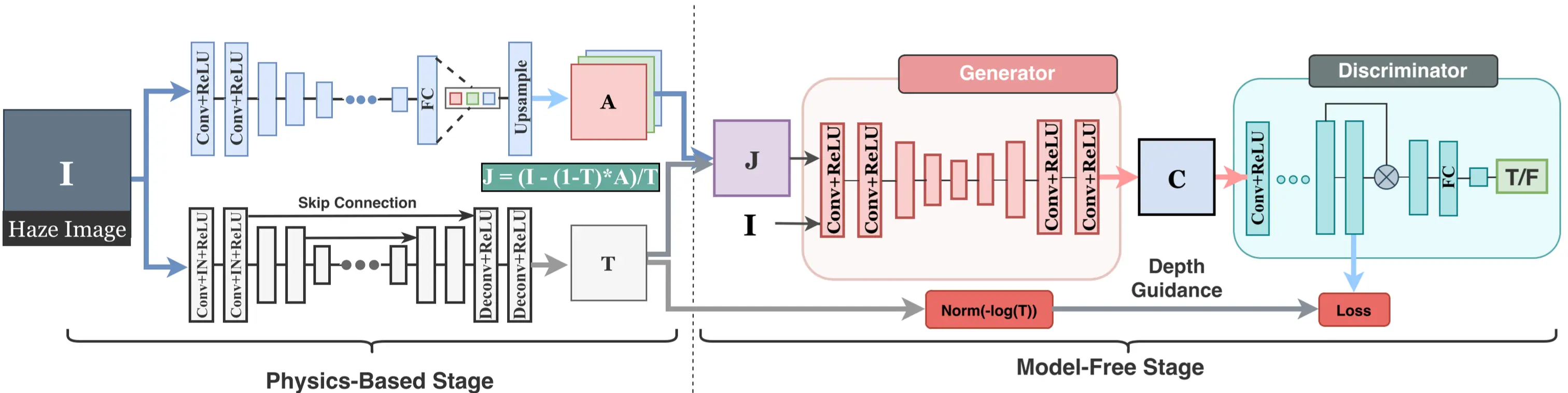 文章提出的网络主要设计为简单并且能够为移动设备所实时使用,故对网络的大小和运算速度有一定的要求。 网络的第一阶段Physics-Based Stage目标在于得到A和t的结果,并结合大气散射模型估算J。 网络的第二阶段Model-Free Stage目标在于细化J的结果,并辅以对抗式生成网络。 文章表示,之所以使用两阶段网络,是因为大气散射模型是真实雾场景的近似表示,可以提供一定的信息。但由于是近似表示,所以添加了第二阶段的网络,即物理模型自由网络,不借助任何模型,不受大气散射模型的约束。