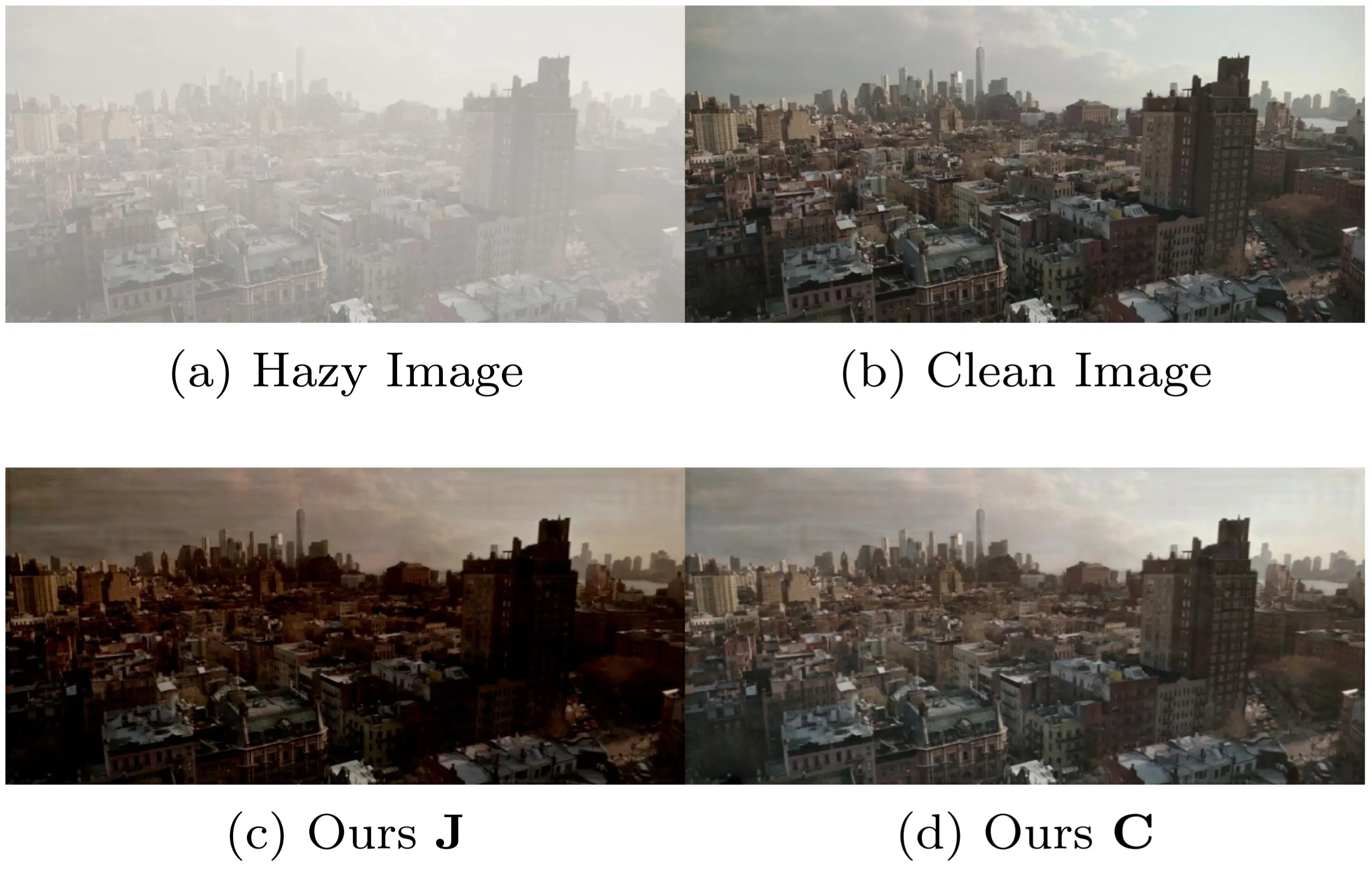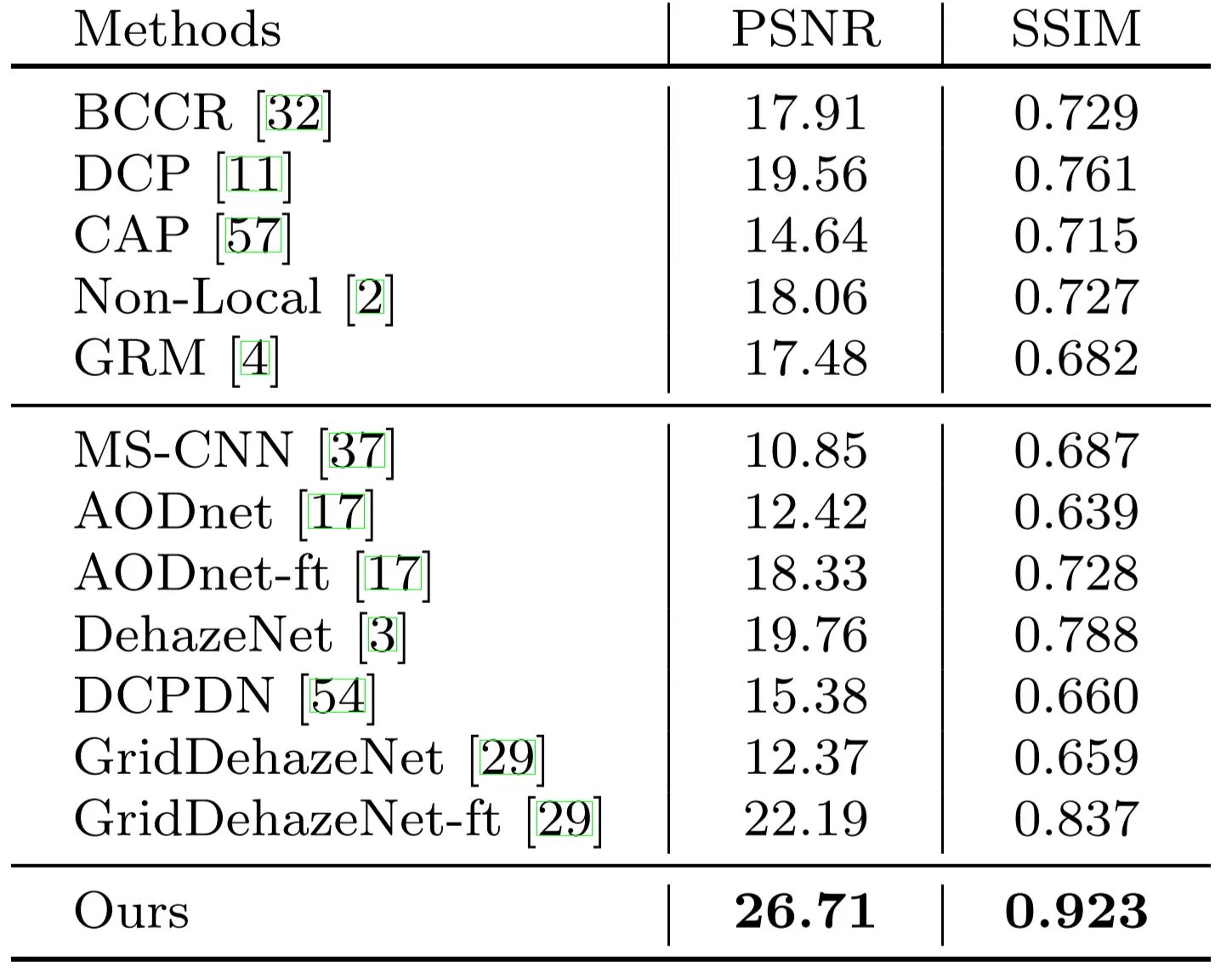 文章提出的去雾数据集总共包含2000张清晰干净的无雾图像,其分辨率均为1920*1080。在每张无雾图像上生成5个不同传输图以获得1W张有雾图像,并将其中8000张作为训练集,其余2000张作为测试集。