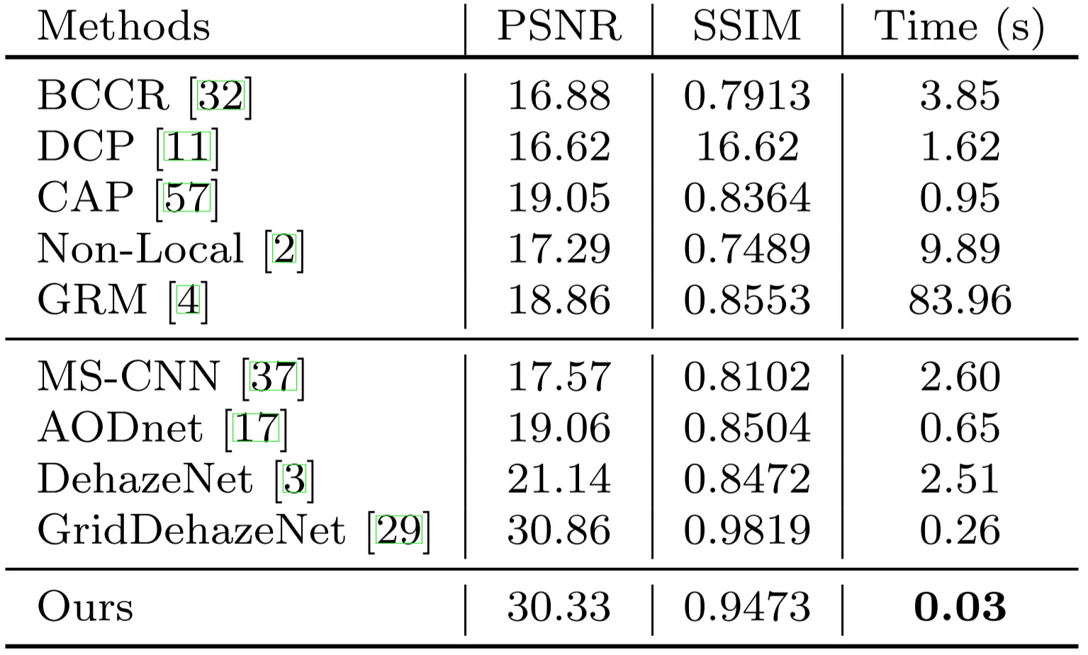 文章表示,与高级视觉任务不同,去雾这种低级视觉任务需要获得逐像素准确的数据。 并且在过去的算法中,大部分算法的网络规模非常大,无法应用于户外的可移动设备。并且大多数现有的网络都以3FPS工作或者更低。
